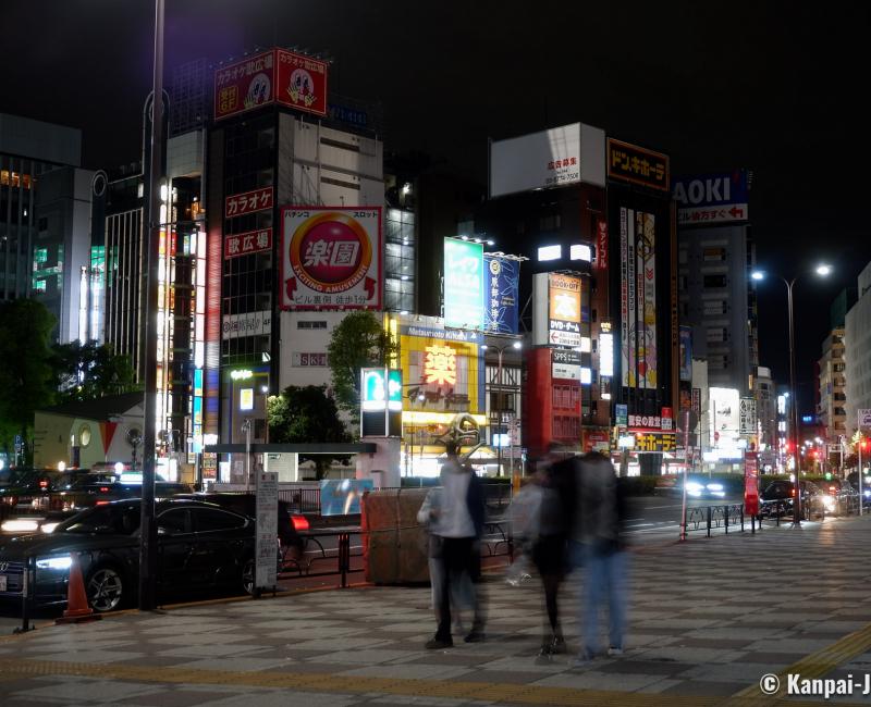 Akihabara, the famous area dedicated to Japanese pop-culture such as manga, cosplay, arcade games and maid cafƩs is a little bit further south on the Yamanote line. The "Electric Town" exit, usually lively, was a lot less crowded the night we visited.