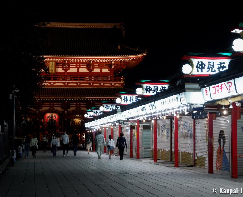 We quickly went up the shopping street, in a straight line permitted by the absence of crowd, and reached the second large gate: Hanzo-mon and the wonderful 5-story pagoda standing next to it. The large incense burner jokoro was extinguished and the doors of the main hall Hondo were closed, as well as the shopping arcades neighboring the temple. From there, the Tokyo SkyTree was visible, but its light-up was toned down compared to usual. However, the opportunity to enjoy the traditional district of Asakusa in a quiet atmosphere was quite pleasurable, provided that it is not forever of course.