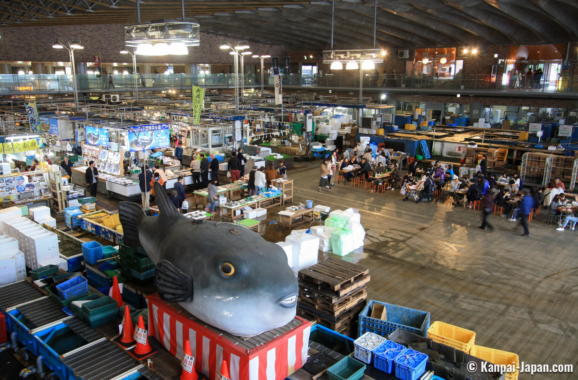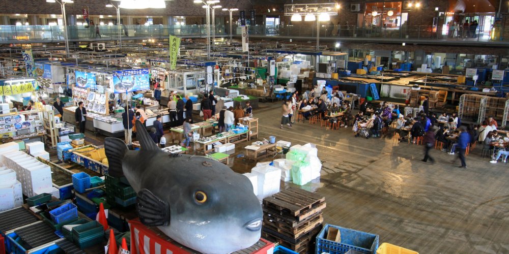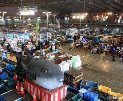 Shimonoseki, in Yamaguchi prefecture at the westernmost end of Honshu, is known as the Fugu Mecca. There, the fish is called fuku, an homophone of the word fuku meaning "happiness", as a reminder of the importance of the fish in the area’s economy. Shimonoseki is the main hub in the fugu supply chain, whether the fish is farmed, wild or imported. Its Karato fish market sells most of the existing fugu dishes, that are properly prepared by certified fishmongers. Fugu is also packaged to be sent throughout the country.