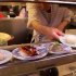 - The more modern kaiten-zushi (回転寿司) with a conveyor belt counter from which one takes the plates that are ready made, and according to one’s taste. At the end of the meal, the bill amounts to the number of plates used and their value per unit, with prices starting from ¥100 to 150 (~US$0.65 to ~US$0.97) VAT not included. The brands Sushiro and Hamazushi are among the most popular and affordable Japanese kaiten-zushi chains; and,