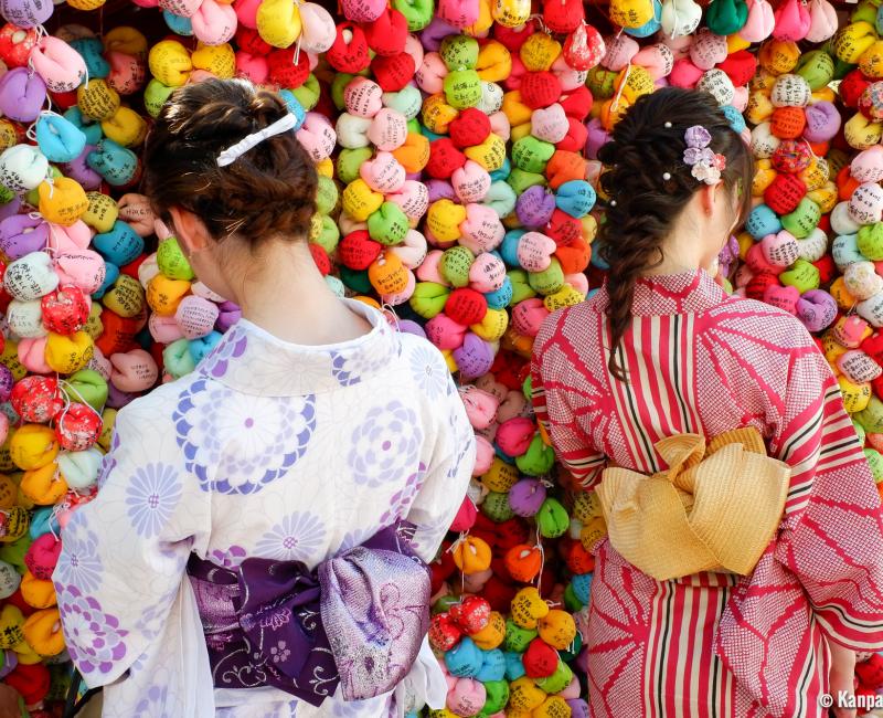 Balls of bright, photogenic fabric called kukurizaru are the temple’s main attractions. They hang everywhere, even on numerous garlands inside the temple, and create gorgeous, colorful walls that present a totally "Instagram-worthy" background perfect for publishing a nice picture on social media or posing for a portrait. Japanese people do not hesitate to visit the temple in their traditional yukata 👘.