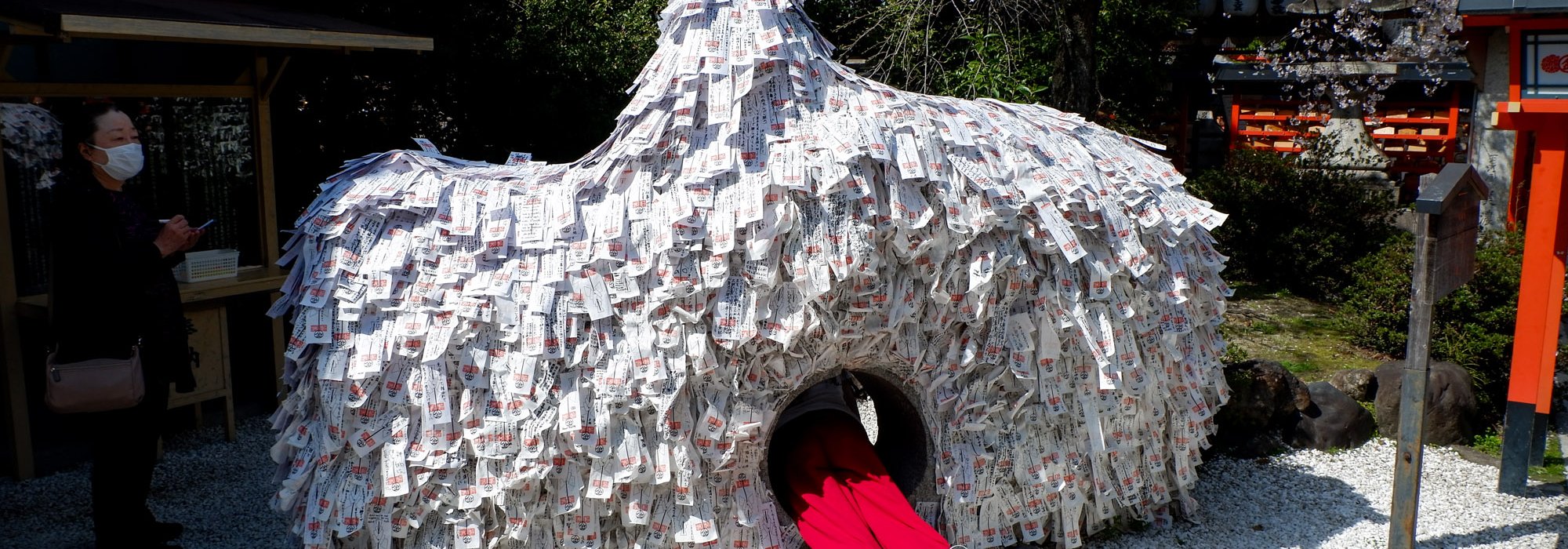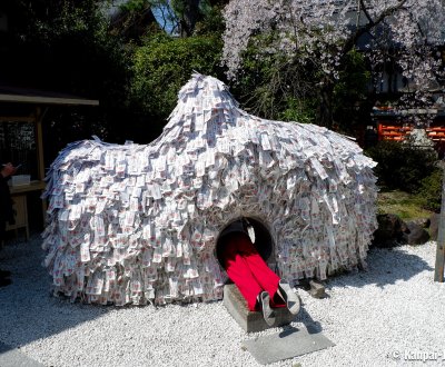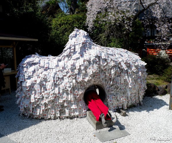 The true shape of the stone is hidden by the thousands of katashiro covering it. Visitors are indeed many to come and pray for their love life, all the more as the ritual can be performed H24, and the talismans are purchasable from a self-service box (donation required) placed near the stone.