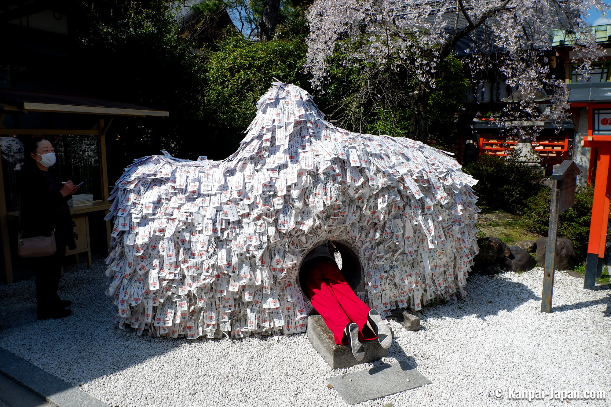 The popular name of Yasui Konpiragu is "enkiri jinja" (縁切り神社), that is to say the "shrine to break off bad relationships." Its centerpiece is a big 1,5m high and 3 meters wide rock whose shape recalls of an ema, with its bottom part pierced by a hole just big enough for an adult to crawl in. The stone in named enkiri enmusubi ishi (縁切り縁結び碑, rock to end or begin relationships) in Japanese, or power stone monument in English, and is situated near the main pavilion Honden. Its name implies that it has the power to cut ties with a former lover or on the opposite to help the bonding of a new couple.