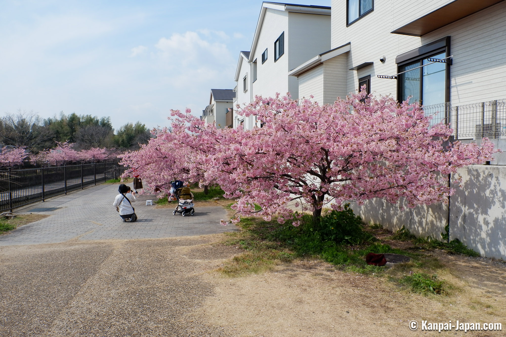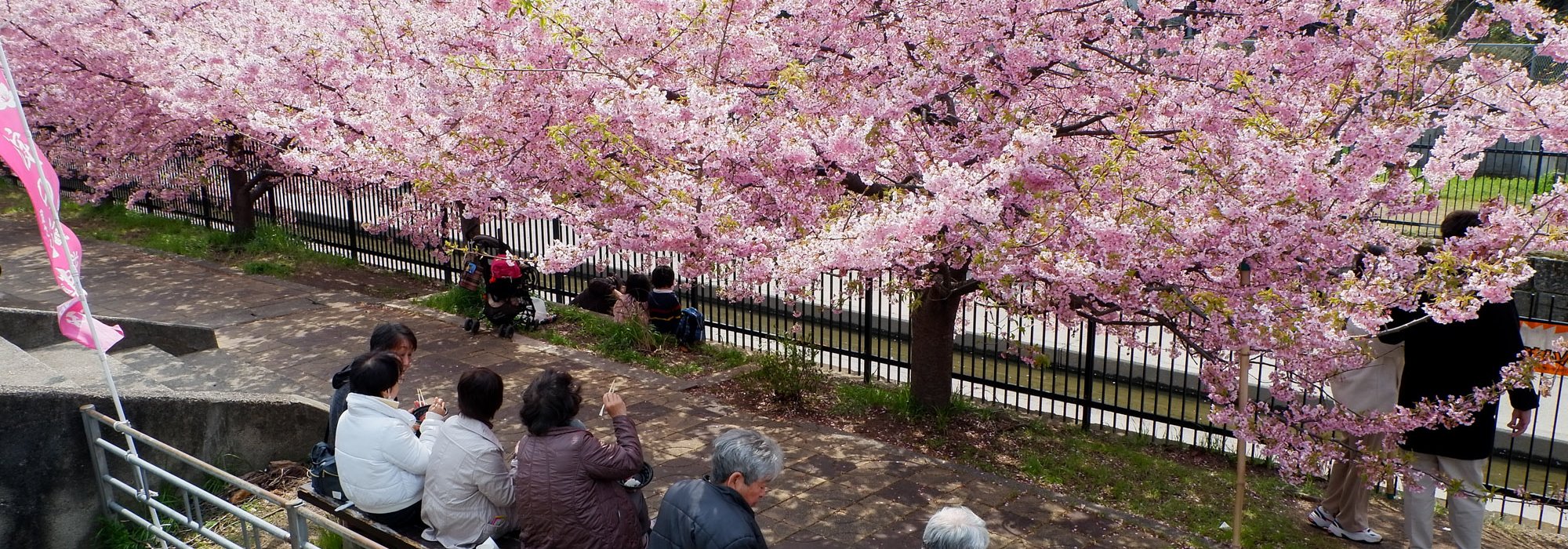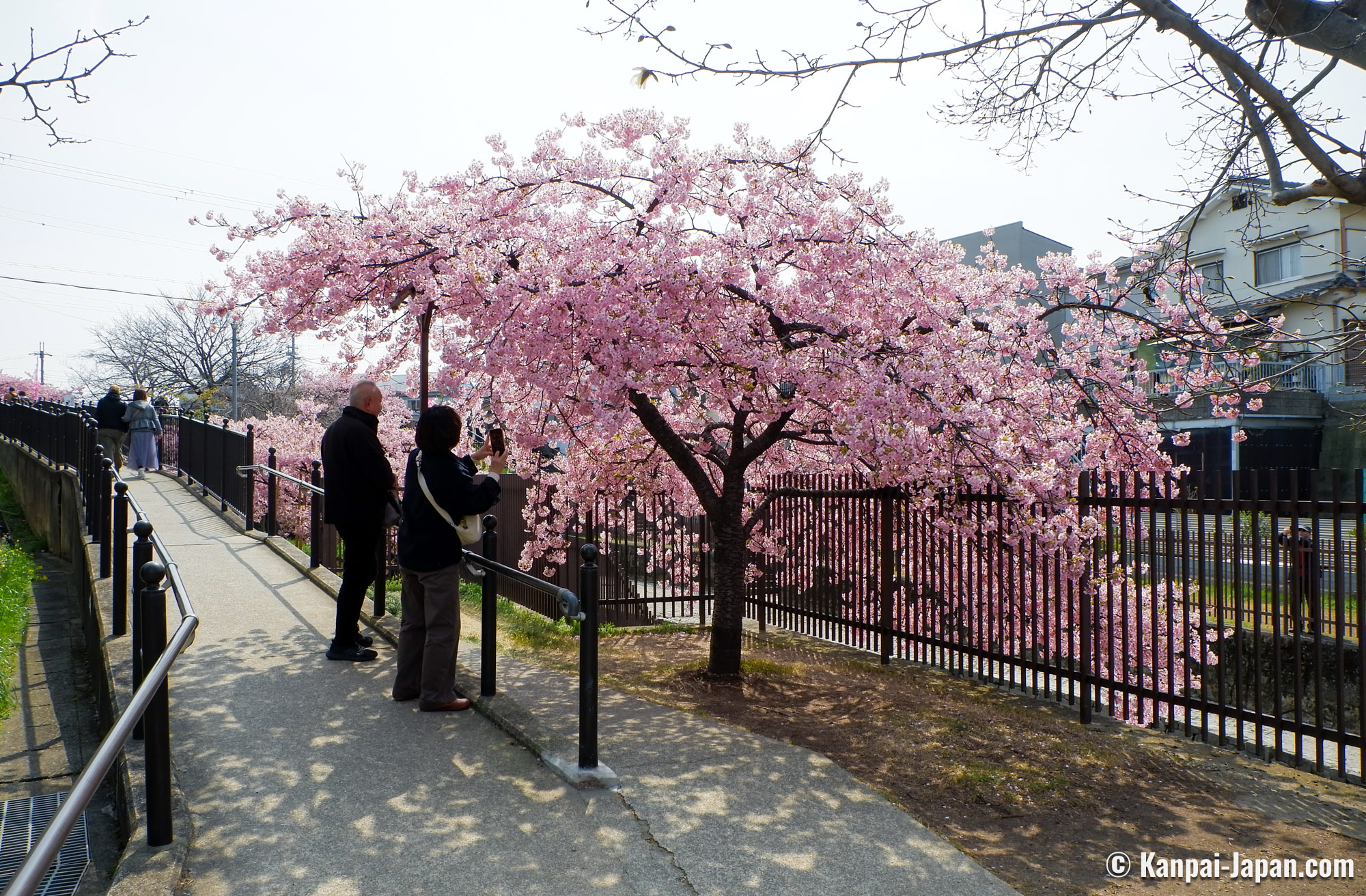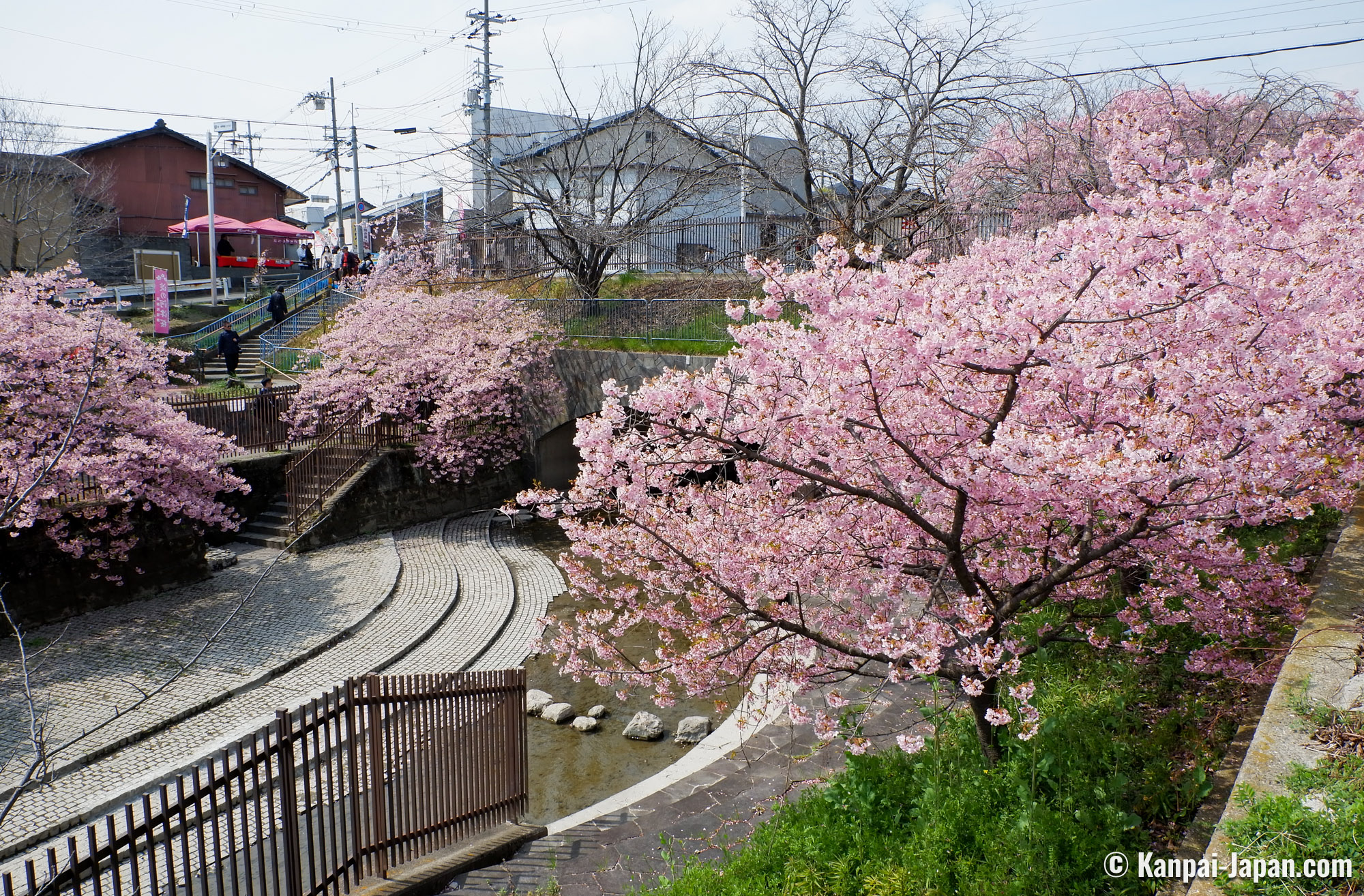 The surroundings of Yodo station remain off the usual touristic beaten track in the former imperial capital. The waterway is winding in the heart of residential areas with a quiet atmosphere and without any other attraction than the flowering of the Kawazu cherry trees. This spot has become popular over the recent years thanks to social medias, and the city doesn’t organize any seasonal matsuri; consequently, there is not yatai food stall nor specific event taking place. The only hints are the signs directing to the place where the Kawazu grow by the canal: from the station, follow the 淀の河津桜 (Yodo no kawazu-zakura) signs.