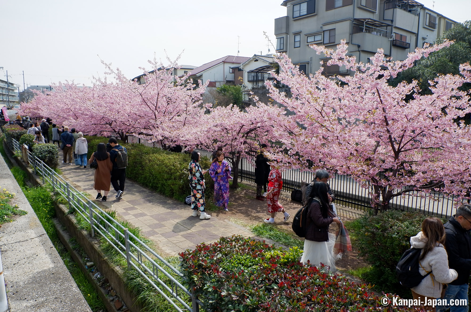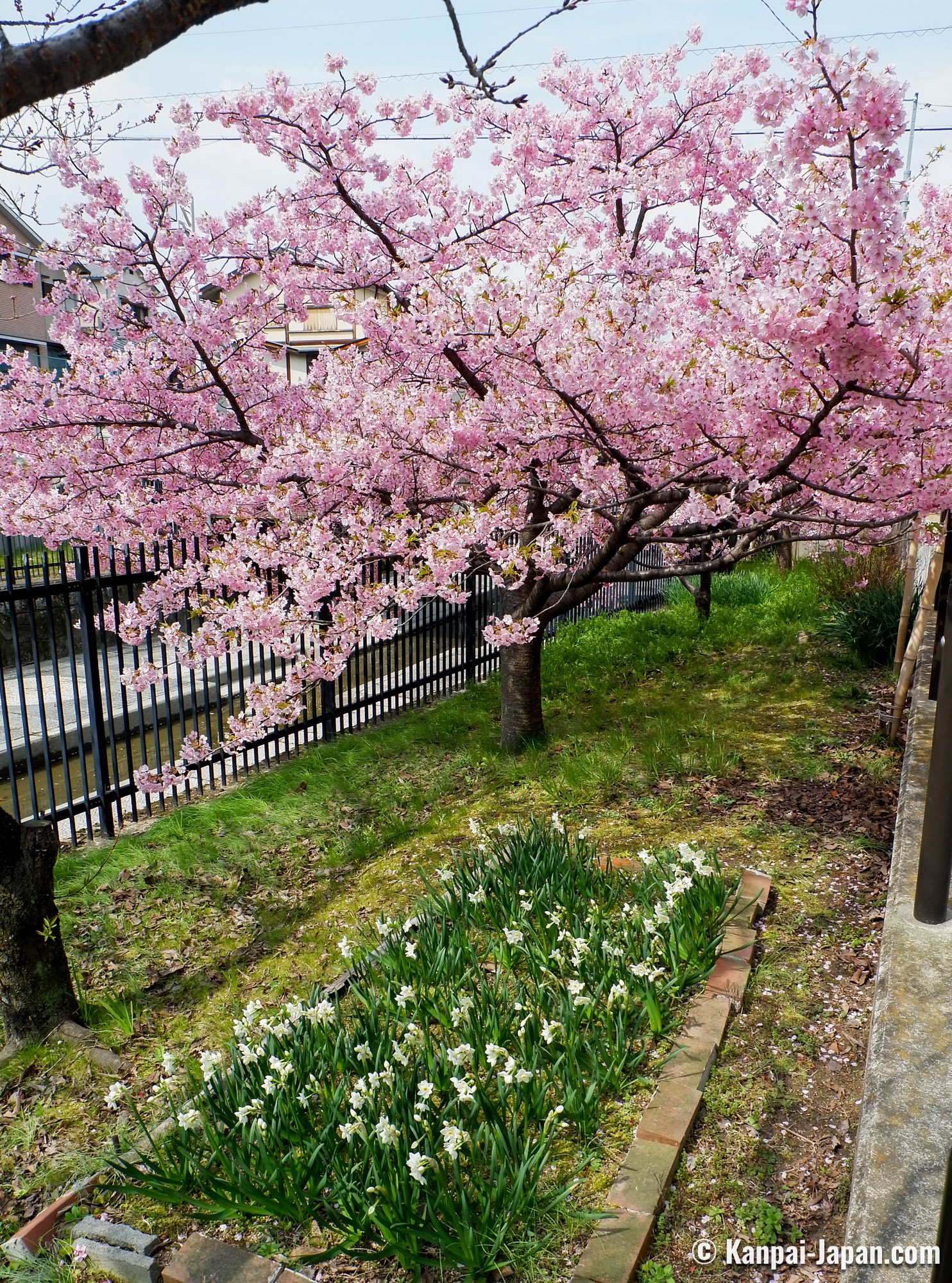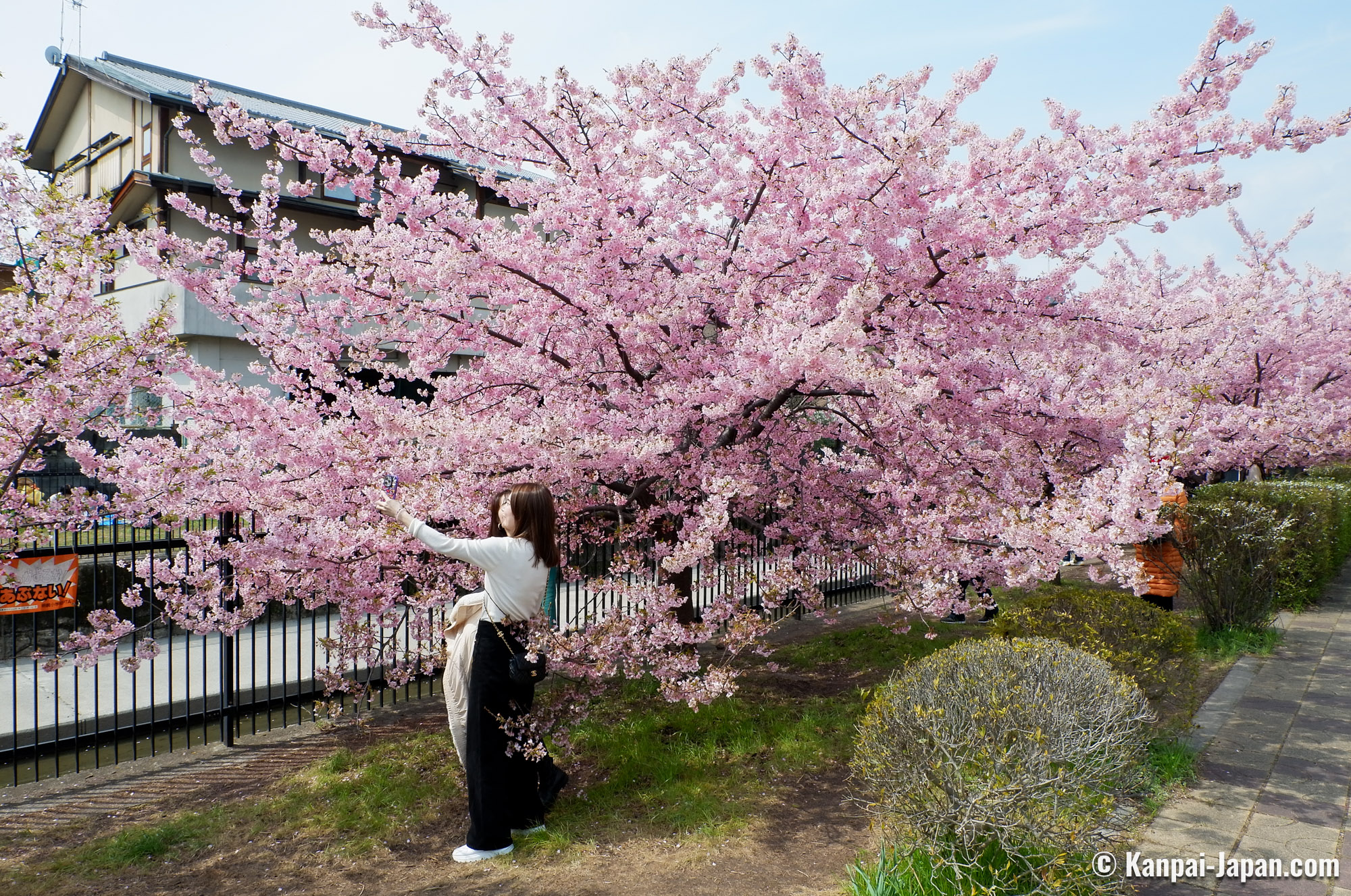 The surroundings of Yodo station remain off the usual touristic beaten track in the former imperial capital. The waterway is winding in the heart of residential areas with a quiet atmosphere and without any other attraction than the flowering of the Kawazu cherry trees. This spot has become popular over the recent years thanks to social medias, and the city doesn’t organize any seasonal matsuri; consequently, there is not yatai food stall nor specific event taking place. The only hints are the signs directing to the place where the Kawazu grow by the canal: from the station, follow the 淀の河津桜 (Yodo no kawazu-zakura) signs.
