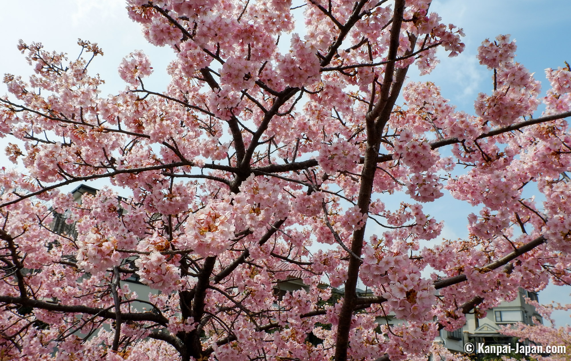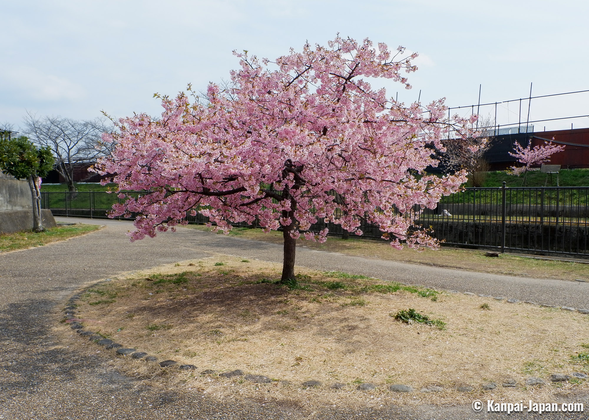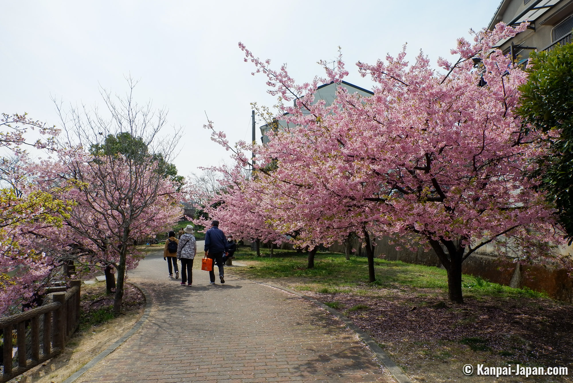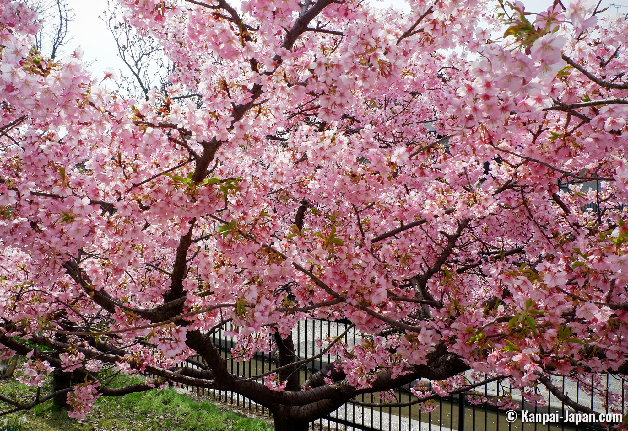 The surroundings of Yodo station remain off the usual touristic beaten track in the former imperial capital. The waterway is winding in the heart of residential areas with a quiet atmosphere and without any other attraction than the flowering of the Kawazu cherry trees. This spot has become popular over the recent years thanks to social medias, and the city doesn’t organize any seasonal matsuri; consequently, there is not yatai food stall nor specific event taking place. The only hints are the signs directing to the place where the Kawazu grow by the canal: from the station, follow the 淀の河津桜 (Yodo no kawazu-zakura) signs.