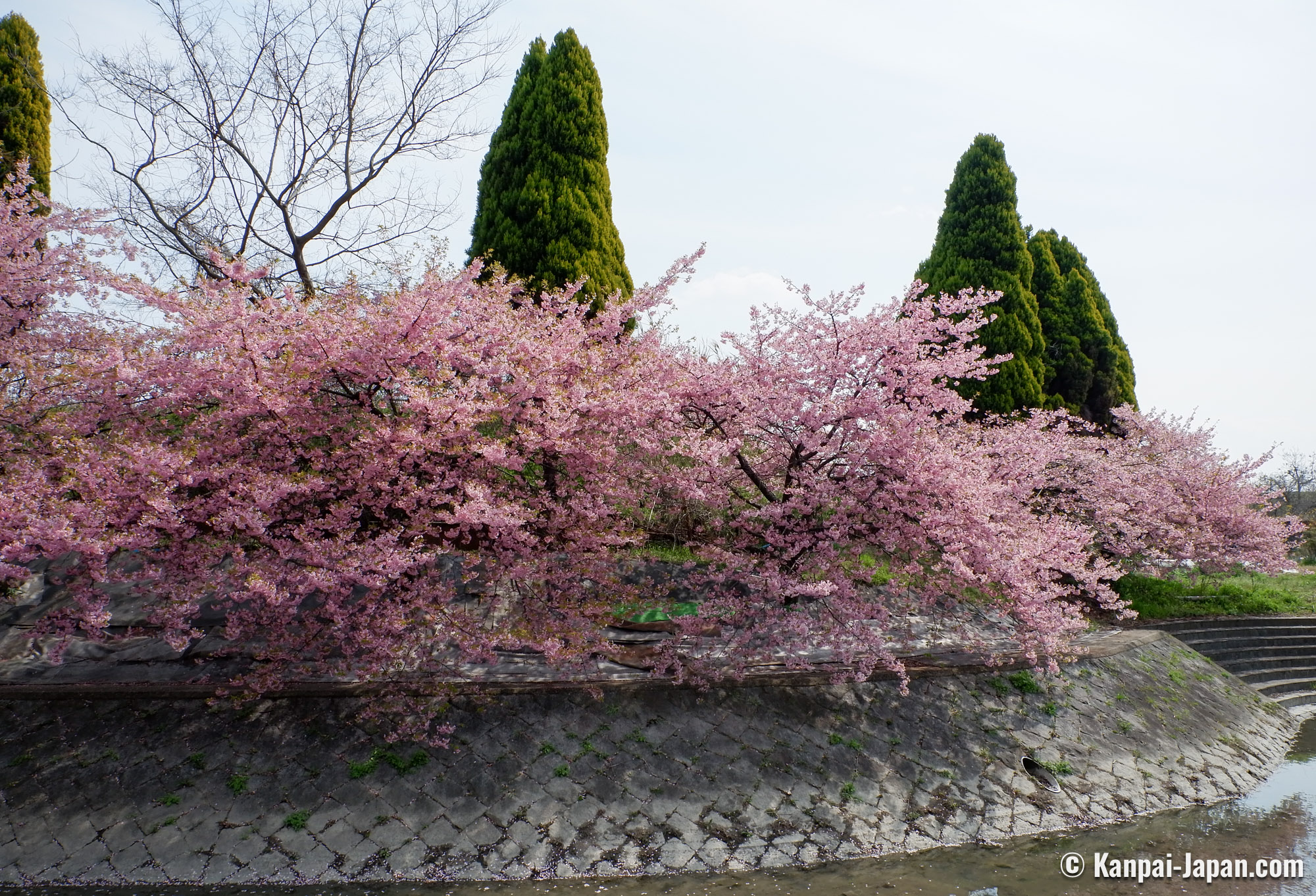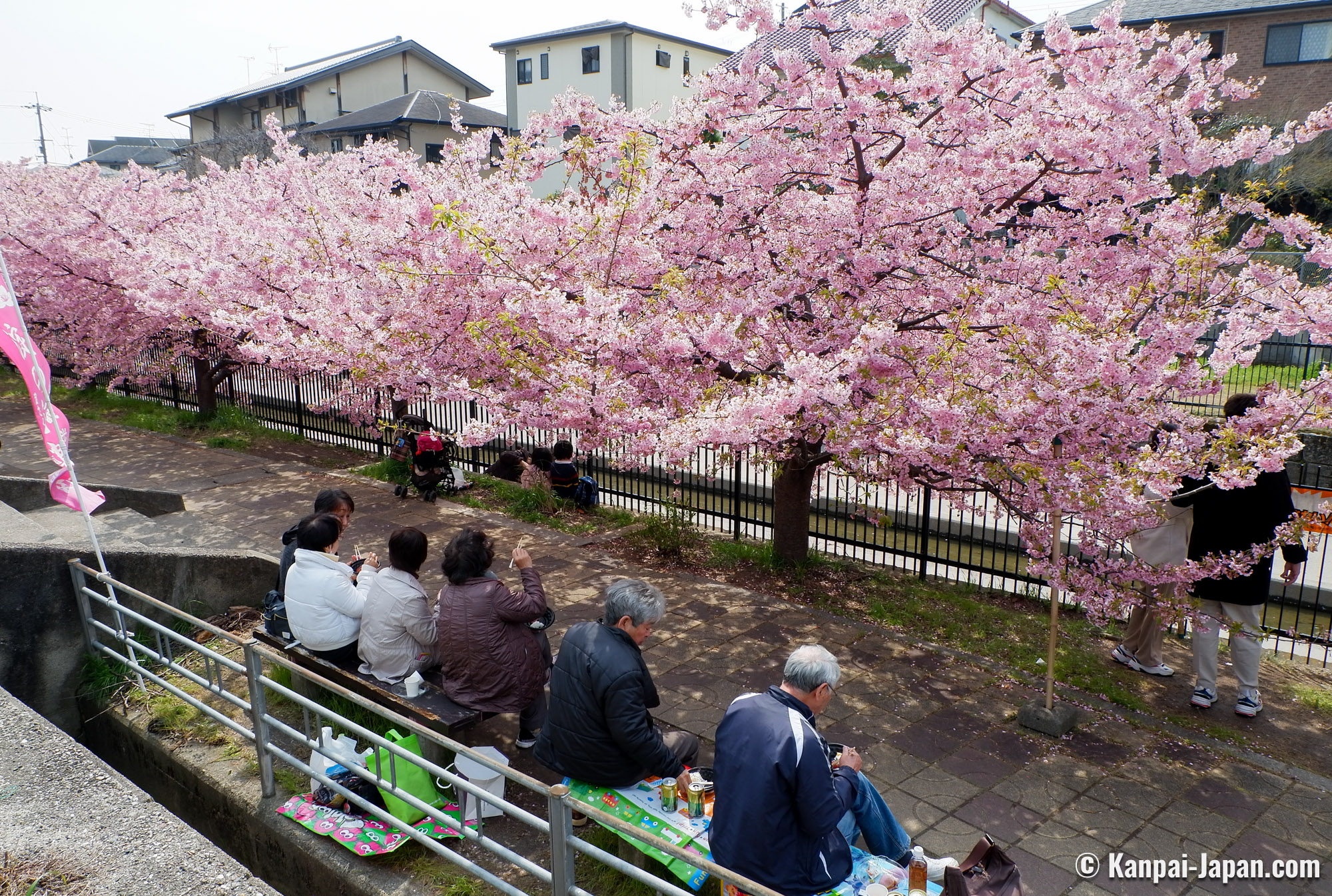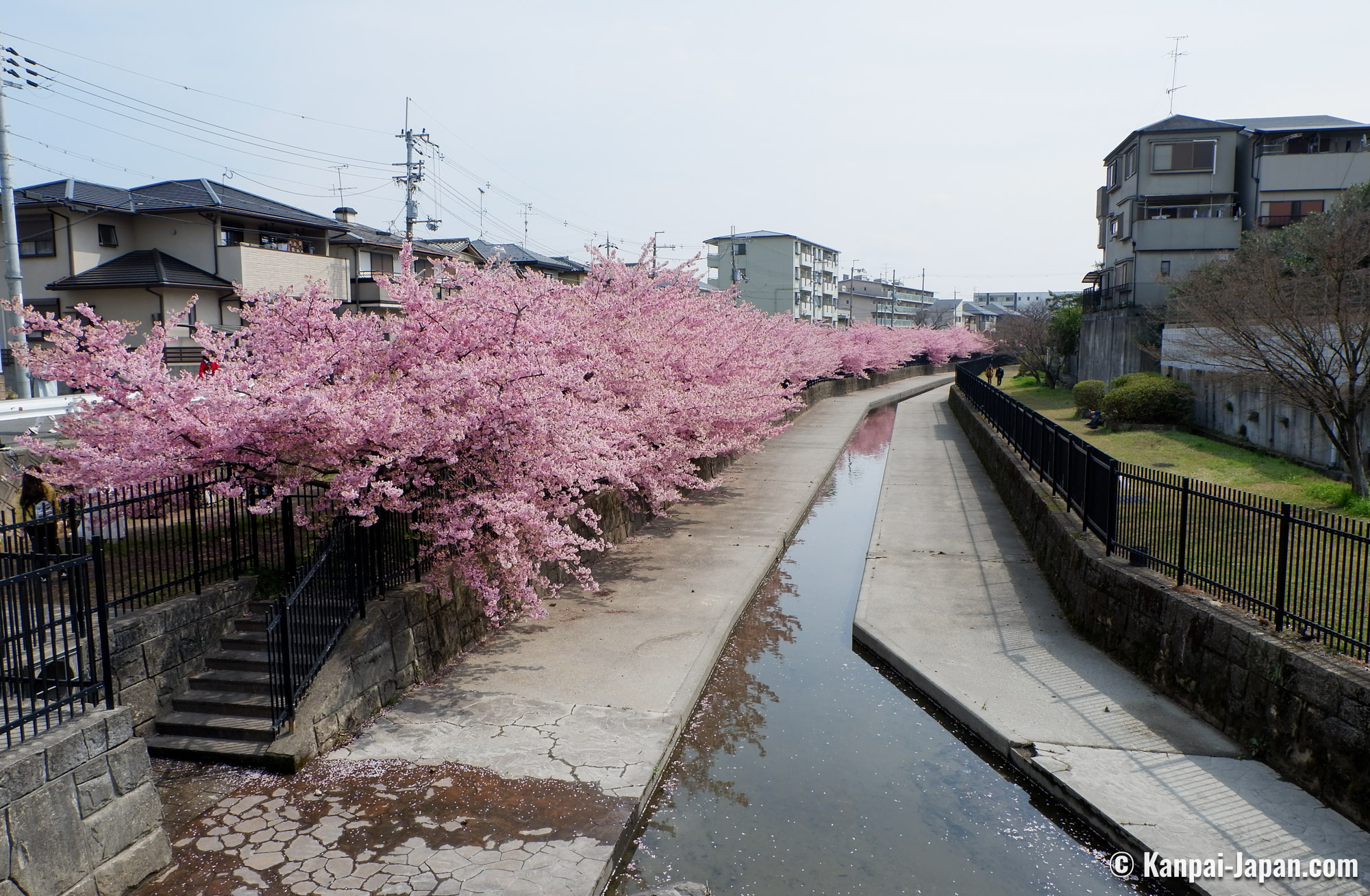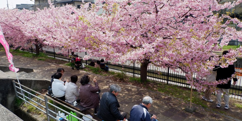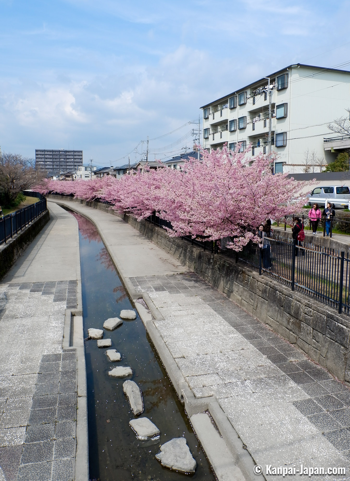 Yodo Suiro Waterway is a canal whose banks are planted with early-blooming Kawazu cherry trees, located in Fushimi ward in the south of Kyoto in Japan. Starting early March, its walkways turn into a sakura blossom spot that people visit for pictures and enjoy food under the first cherry flowers of the year.