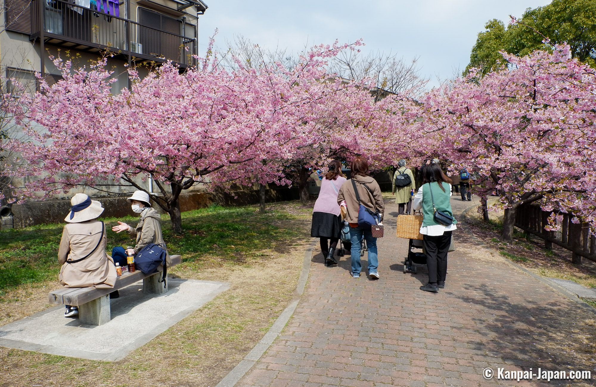 An approx. 1,3km long walk stretches along the Yodo Ryokuchi Waterway where about 200 Kawazu cherry trees, originating from Izu Peninsula, have been gradually planted by the municipality since 2002. Bridges have been arranged to cross from one side of the water to another and while following the path of the sakura 🌸. The thriving trees embellish the concrete structures creating a pleasant environment for onlookers to take the time to rest on a bench and eat an outdoor lunch under the bright pink petals, in the manner of the neighborhood’s inhabitants.