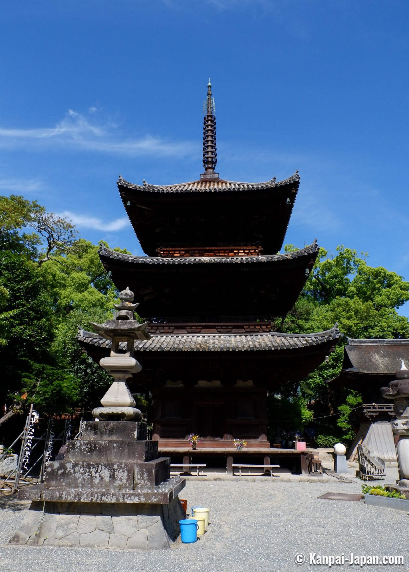 In his golden years between the 8th and the 16th century, Ishite-ji was a large religious complex. Most of its buildings were burnt in 1566 during the civil wars of the Sengoku era, and only the main hall Hondo, the Niomon gate and the 3-stories pagoda were spared. Its reconstructed pavilions spread over about 60 hectares, protected by tall trees providing a pleasant shade and coolness.