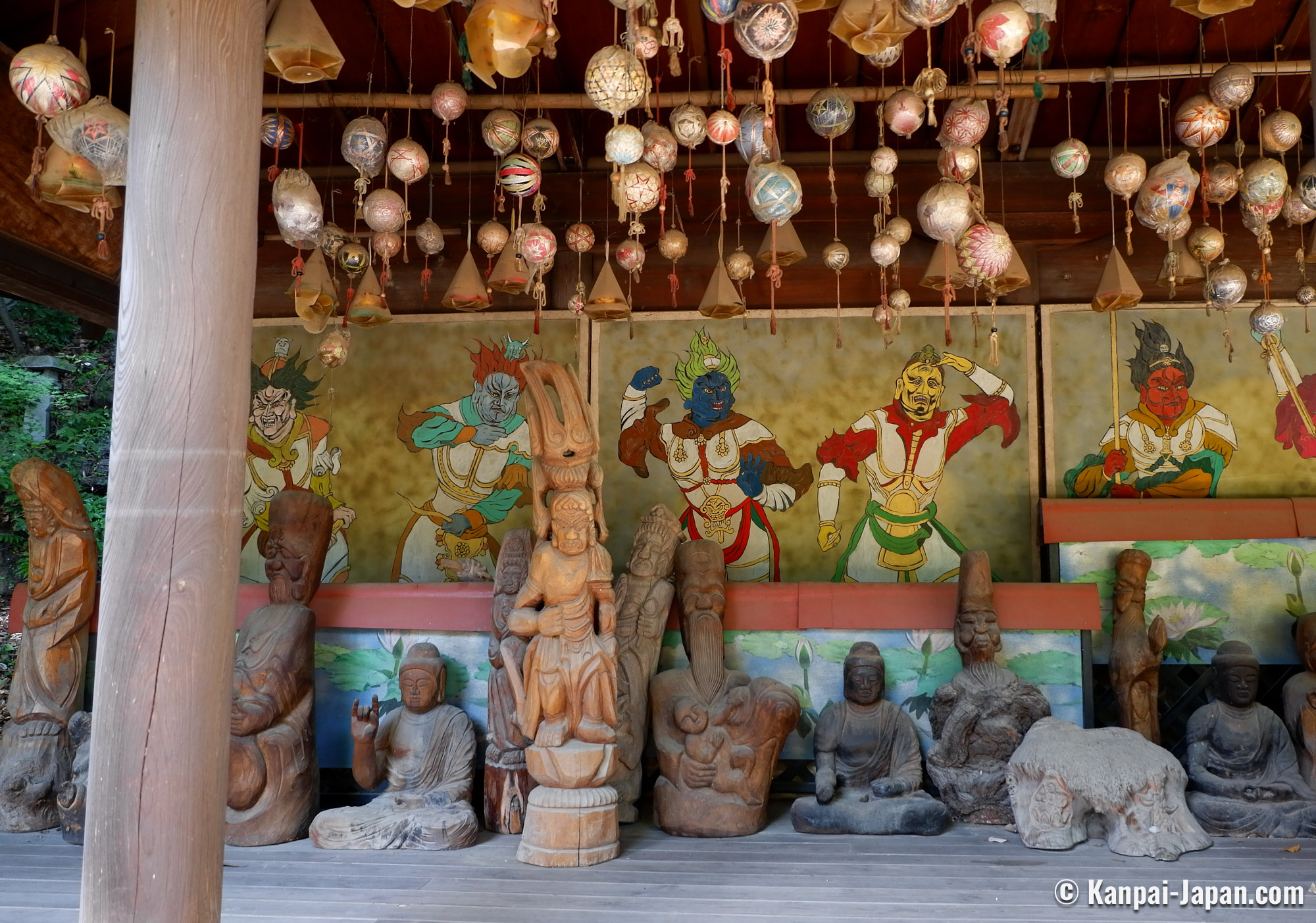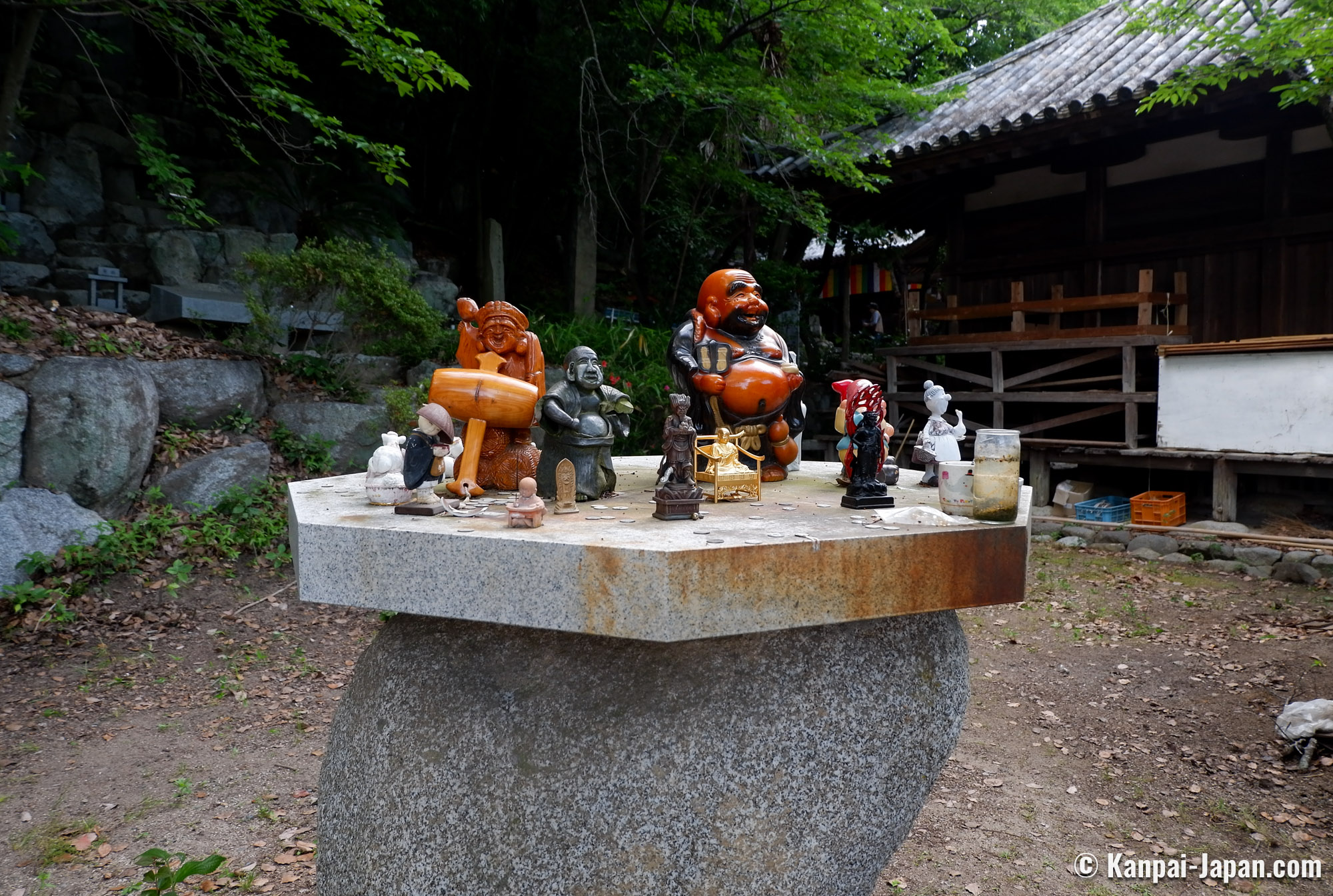 The grounds is always open and may surprise visitors used to Japanese Buddhist temples that are strictly maintained due to its colorful and heteroclit look, and its abundant vegetation. The numerous statues on display, of every styles and periods, representations of Buddhas or of the 7 Lucky Gods are a great part of this templeās charm.