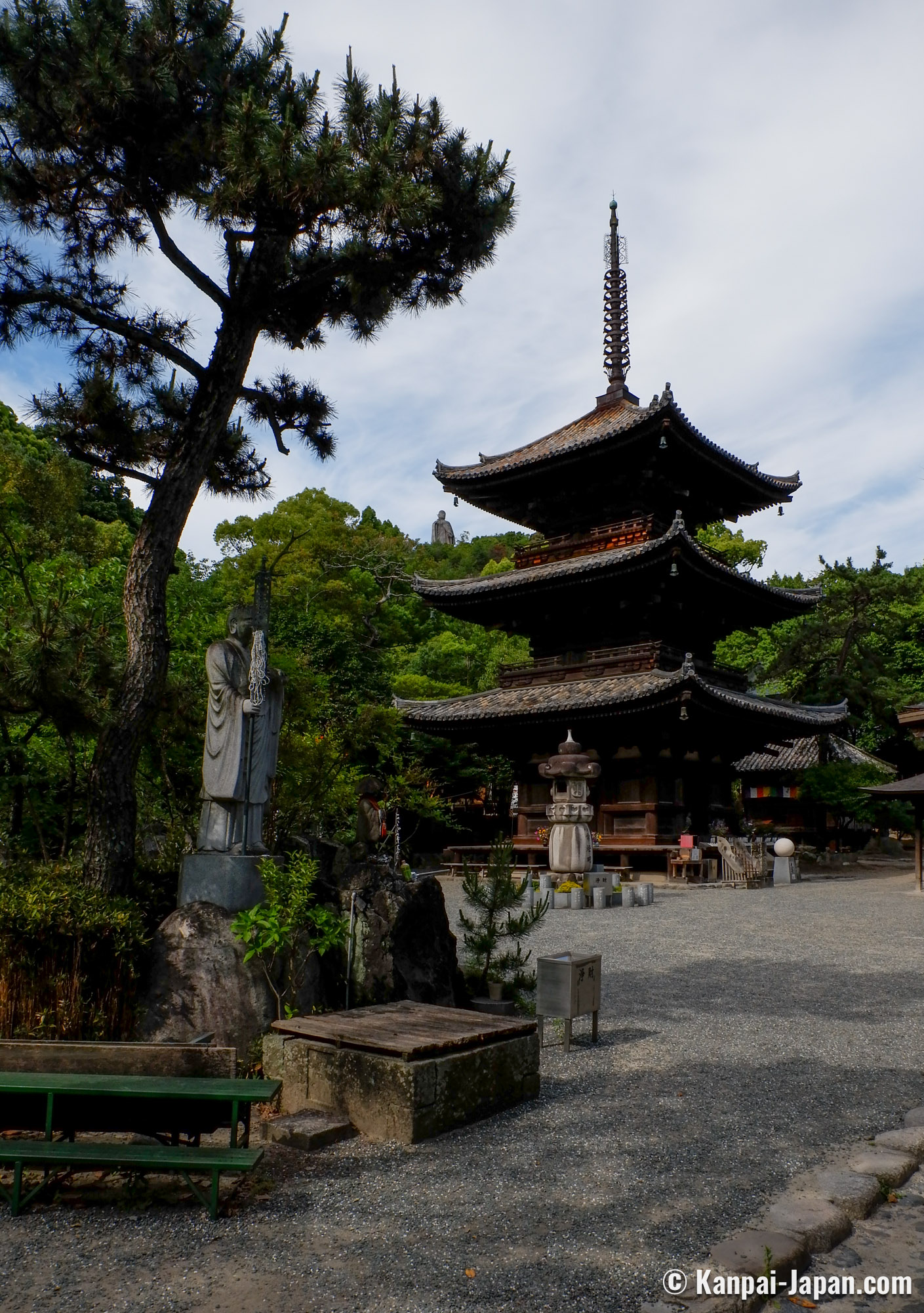 The 2 pagodas, one 3-stories and one 5-stories, date back to the end of the Kamakura period and are designated Important Cultural Properties. In the east of the enclosure, a tall statue of Kobo Daishi standing on the top of a hill rises above the canopy.