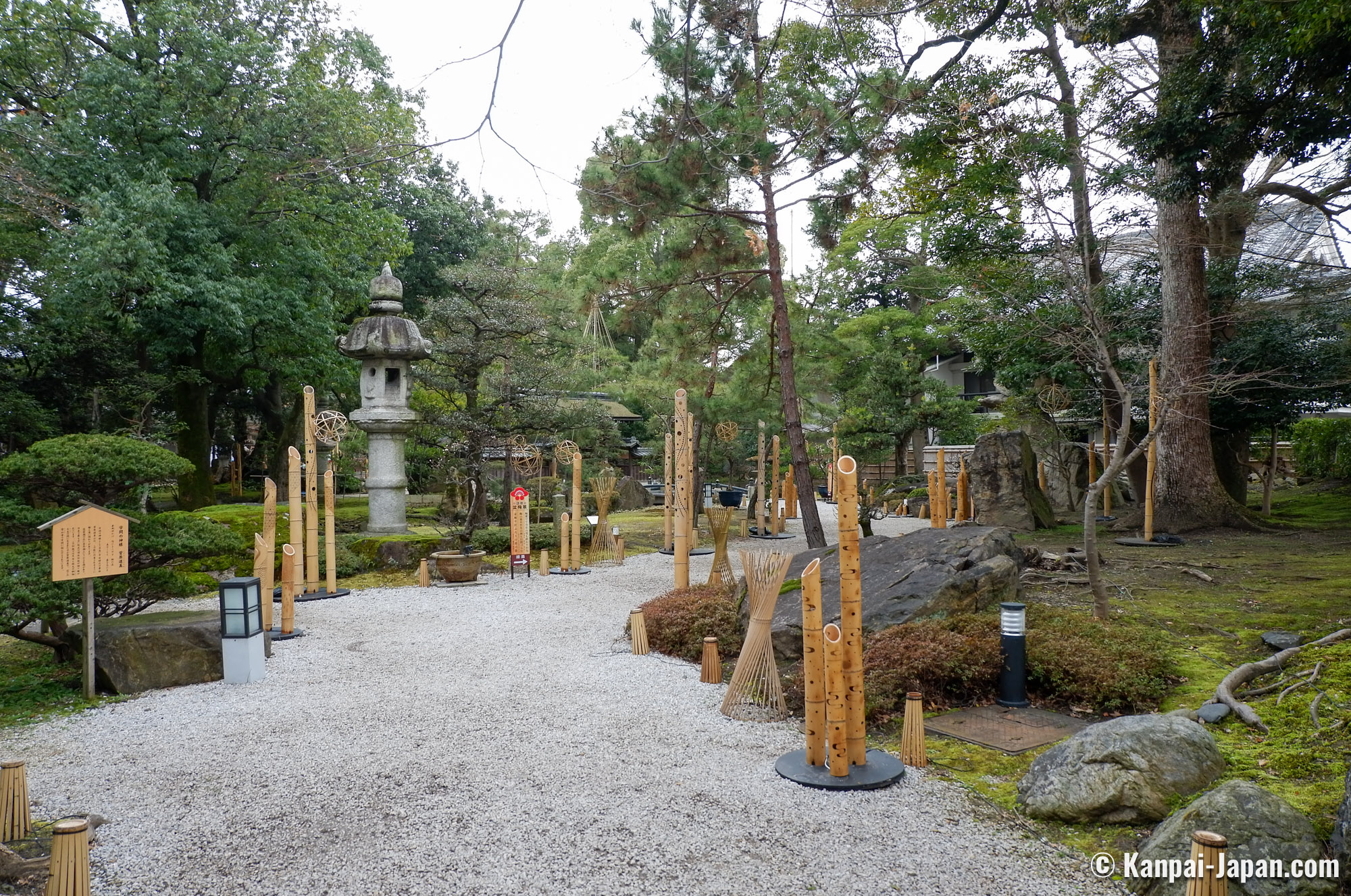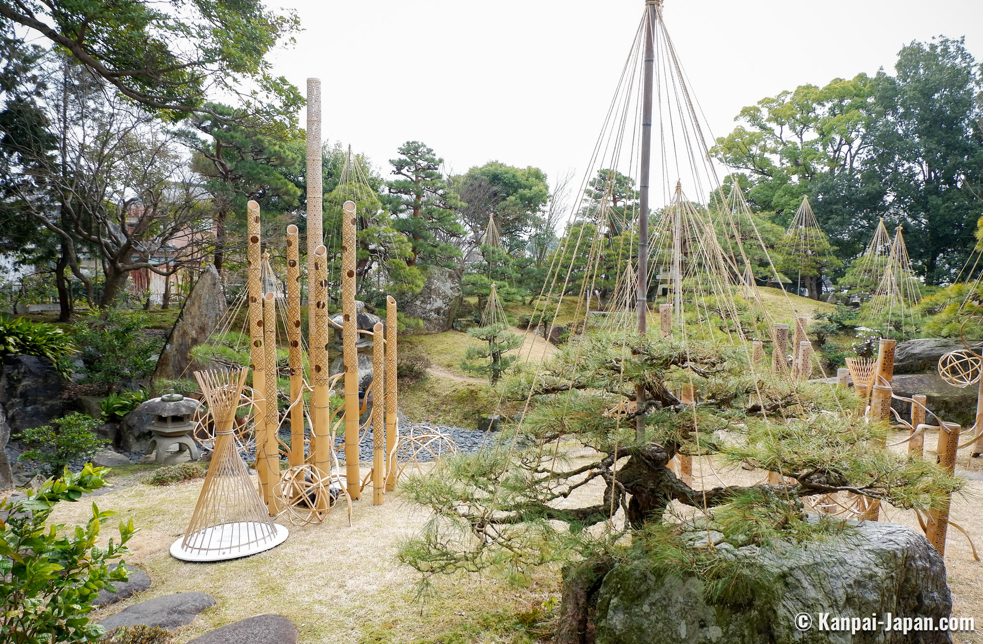 The residence’s Japanese garden, built at the same period by Jihei Ogawa VII (1860 – 1933), remains asleep at this time of the year and complement the visit. The pine trees are covered with their winter protection called yukitsuri (雪吊り). Bamboo decorations are interspersed along the pathways and lit-up at night, when the Keiunkan extends its opening hours for an evening illumination of the plum blossom bonsai.