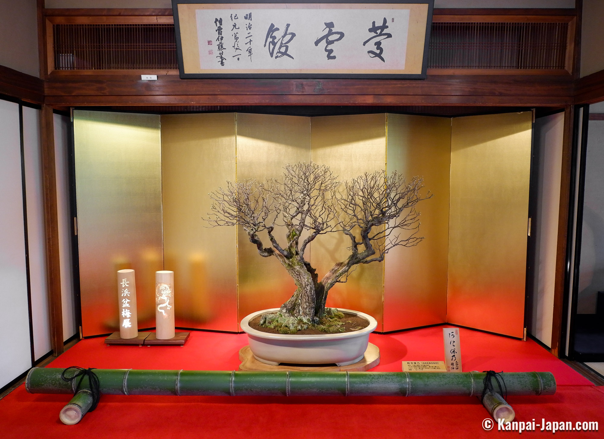 Nagahama Bonbaiten is an exhibition of plum blossom bonsai hosted in the ancient traditional Keiunkan residence, located in Nagahama city on the shore of Lake Biwa, in Shiga prefecture in Japan. About 90 ume bonsai, some of which are several centuries old, are displayed during this floral art event every year from January to early March.