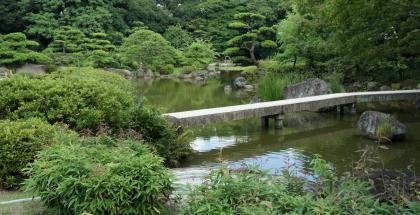 The main attraction starts at the entrance with the canal underneath the gorgeous Sorihashi, nicknamed Taiko-bashi (the drum bridge) due to the reflection of its arch in the water, resembling the percussion instrument. Its shiny red color and strong slope bestow it an original form; stairs are actually necessary to cross it.