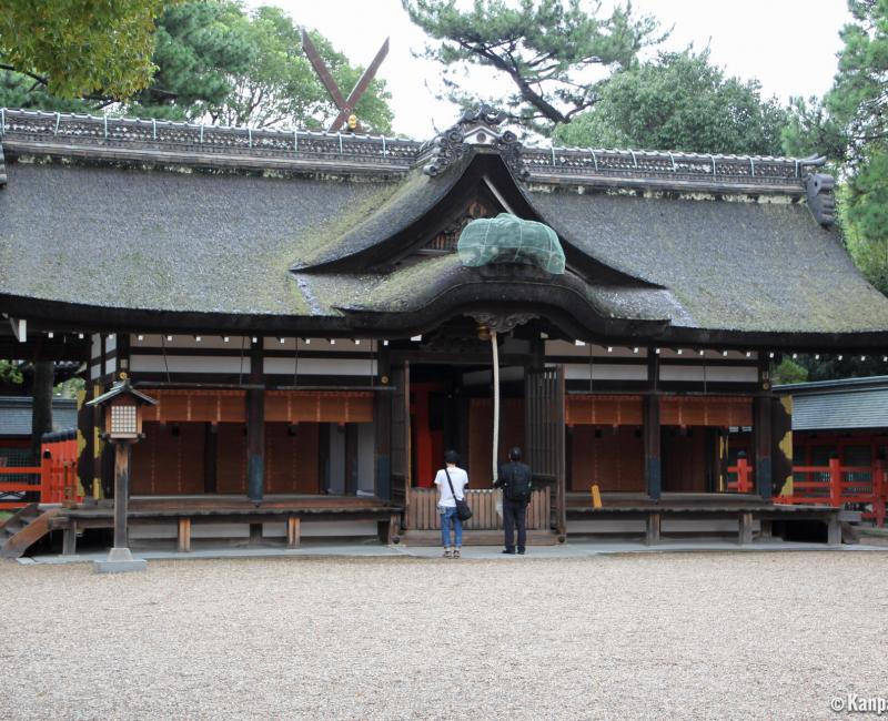 Then we enter the sacred interior, with a view of the main shrine, actually made of four buildings that are perfectly identical, three of which are aligned. Each building is dedicated to a deity kami and protects sailors, boats, and more broadly, the sea industry and travelers. The legendary empress Jingu Kogo is also worshipped here.