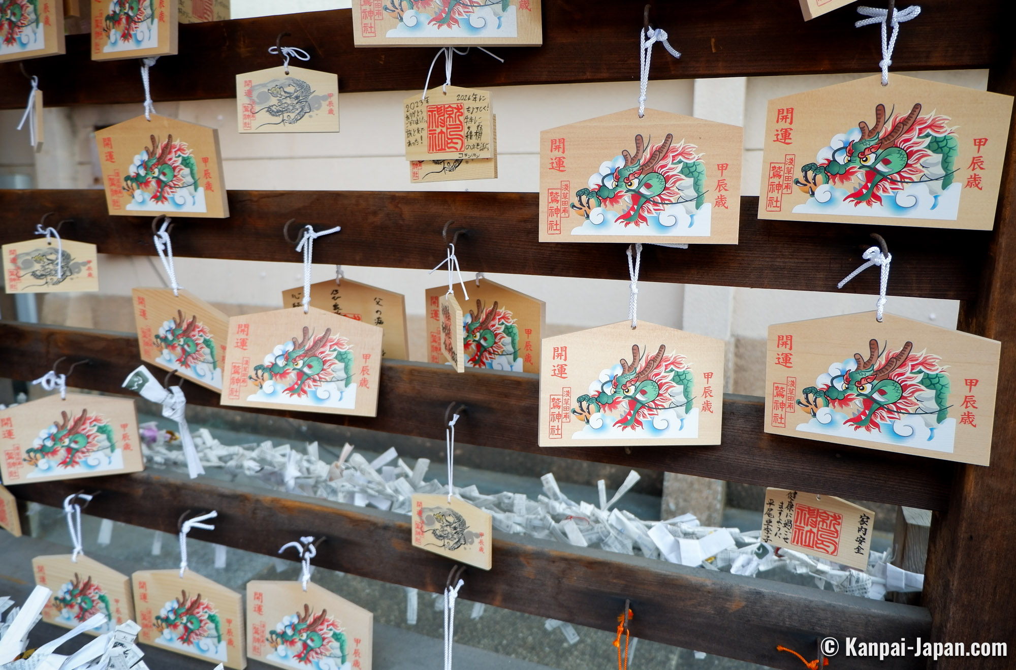 Worshipers also walk through a chinowa grass ring, set up on December 30 for the New Year’s purification ritual called Oharae (大祓). Omikuji fortune papers and ema votive plates decorated with the new year’s Chinese zodiac sign are inscribed with prayers and hanged on display.