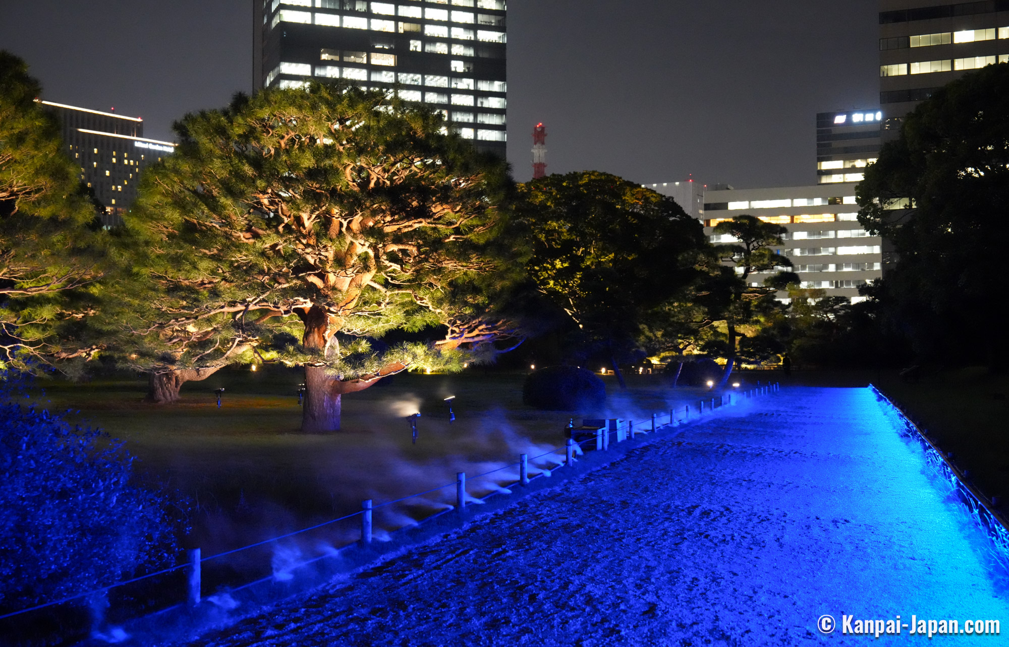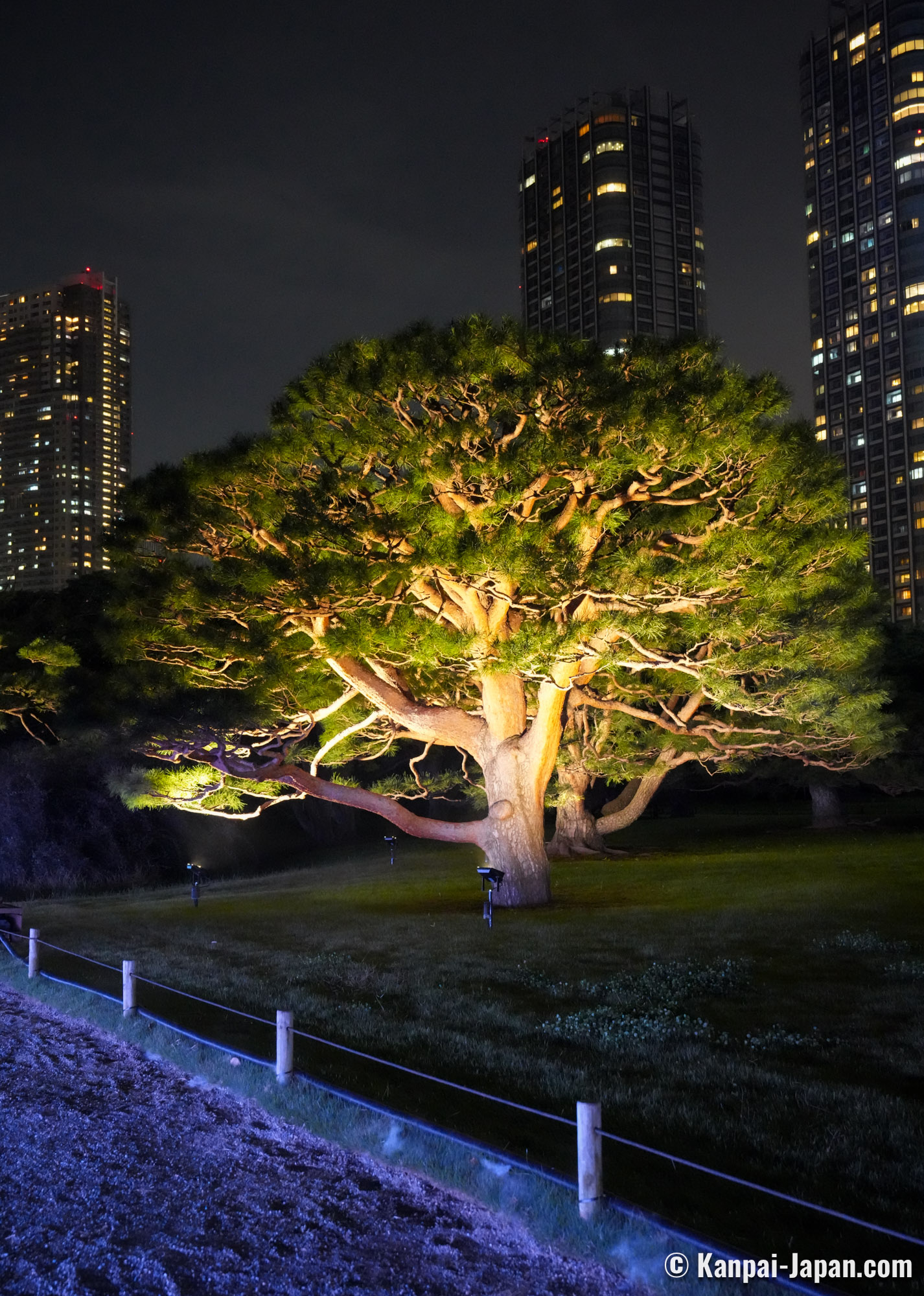 The nightly stroll in Hama-Rikyu starts at the main Otemon gate, where a splendid 300 years old pine tree is standing illuminated by spotlights. It is the oldest pine tree of the Kanto area, and it was planted to honor the 6th shogun of the Tokugawa dynasty. The garden’s other numerous Japanese pine trees also benefit from a beautiful light-up. On the ground, a video mapping recreates the movements of the sea to remind of the place’s singularity: it is indeed located on the shore of Tokyo bay, and its main pond, Shioiri-no-ike, is filled with sea water as tides fluctuate.