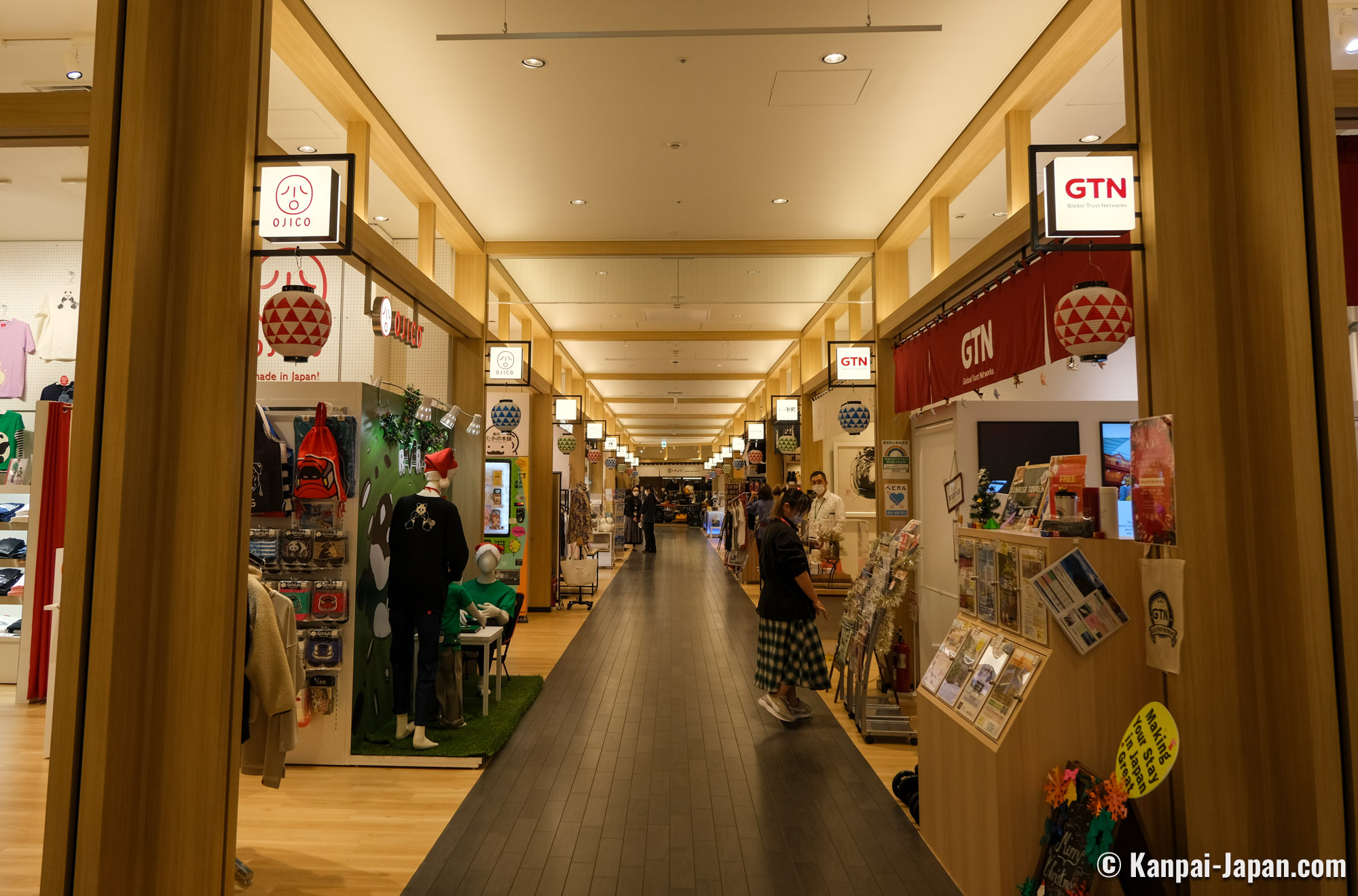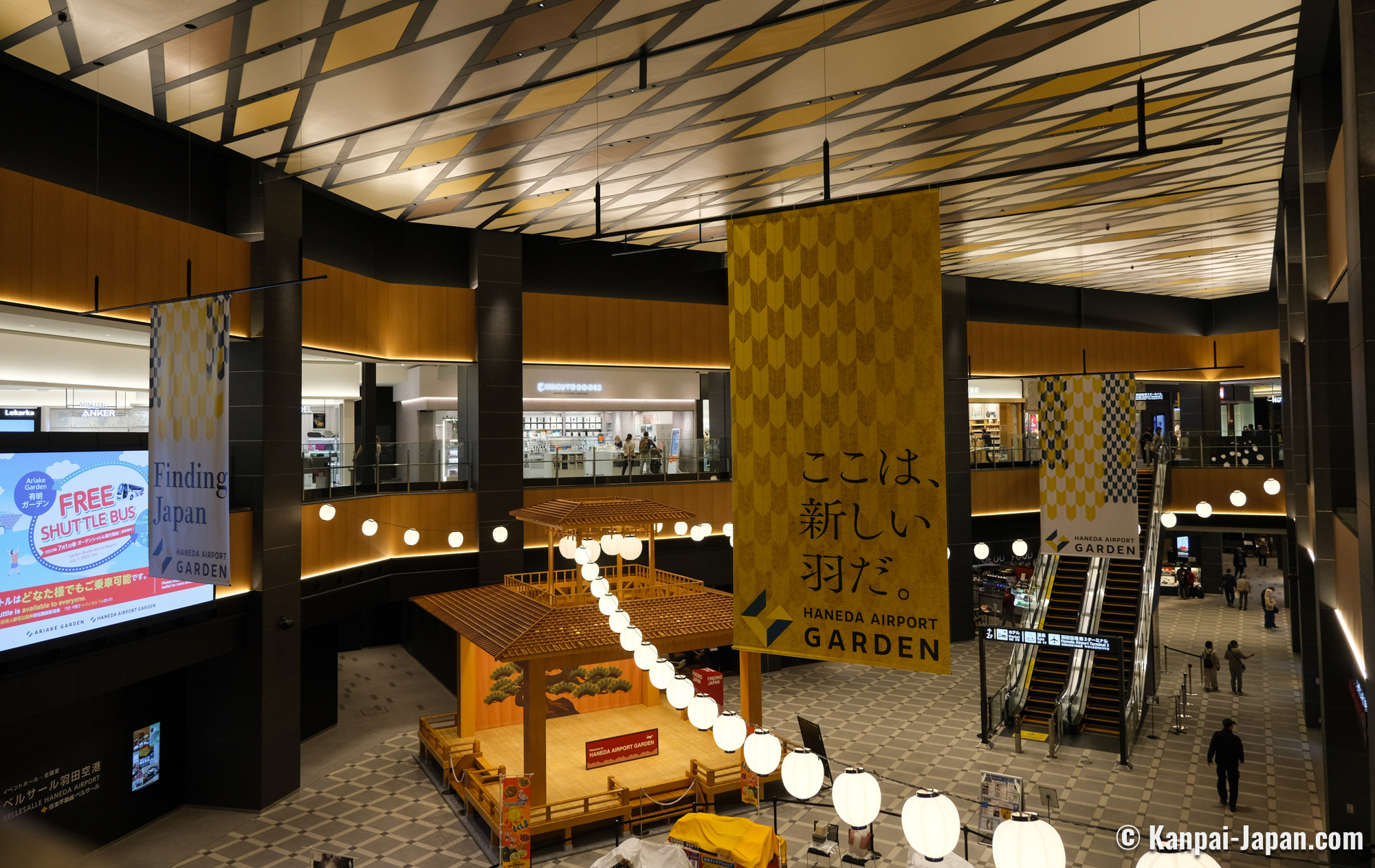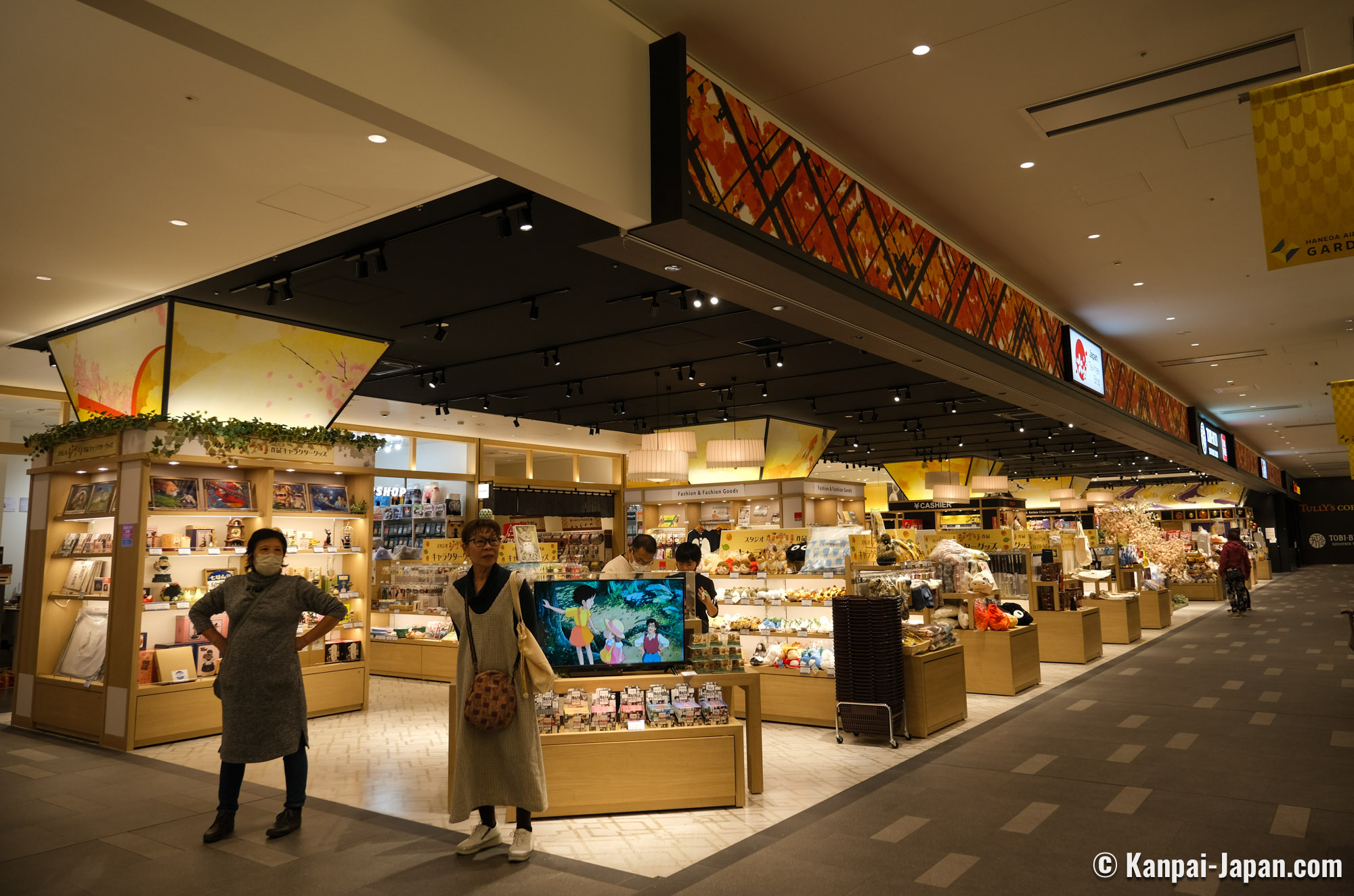 Shops and restaurants are spread over 2 levels around a large triangular atrium. Famous international brands are represented, but most of the shops sell Japanese products, be they traditional (such as umbrellas, Edo-kiriko glass) or more modern (focusing on manga and anime merch), or consisting of fashion and cosmetics. Haneda Airport Garden is showcasing Japan's soft power so prices tend to lean on the luxury side, but finding affordable gifts is possible.